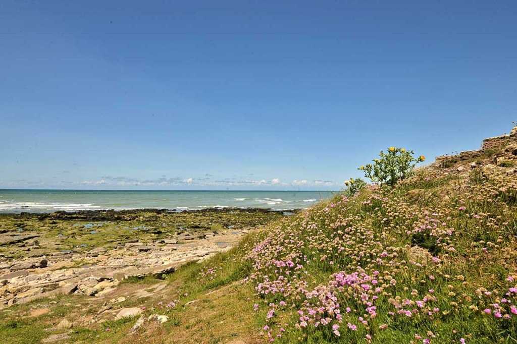 We found a small track that climbed down across the grassy dunes and onto the sandy beach below. There was a stiff breeze keeping the heat of the day at bay. The green grass, enmeshed with pinks and yellows of wild flowers, grew in patchy abundance. All of this gave way to the beach, golden craggy rocks and flat yellow sand, which in turn gave way to the sea, where the water which was almost teal in colour lapped the shore. We tottered over small rock pools and ambled along the sand, jumping over the deeper streams that were making their way down the beach. Sat on the craggy rocks, we realised time was running away with us and decided to move on.